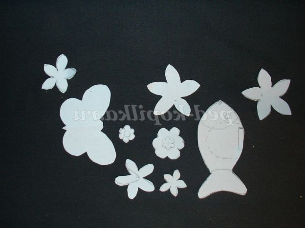 Спочатку діти обводять трафарети, потім вирізаємо з дітьми паперові викрійки для елементів плаката - рибки, квіти.