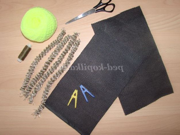 Два клаптики 18х28 см(я використовувала товсту, синтетичну тканину), нитки для гриви і хвоста (я використовувала декоративну стрічку від штор, розрізала на чотири частини, по22см кожну), 2 білизняні прищіпки, котушкові нитки для обмотки та закріплення деталей, товсті яскраві нитки для копит, візерунок на грудях, ножиці для обрізки нитки.