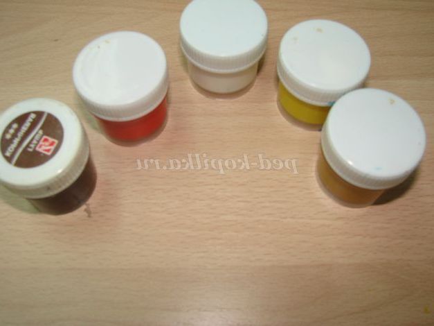 Фарбуємо гуашшю за допомогою губки, «причпокивая». В даному варіанті - це білий, жовтий, цегляний, рожевий, коричневий відтінки.