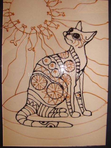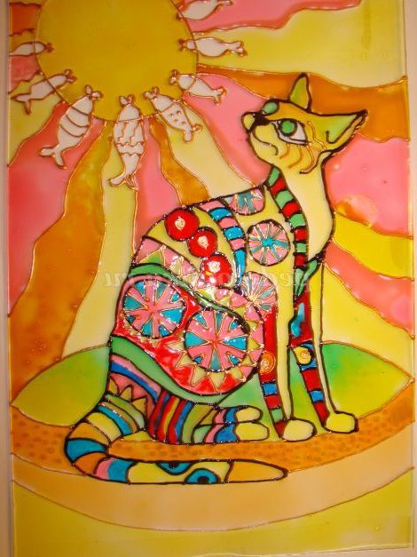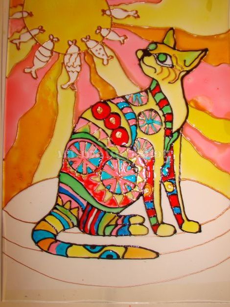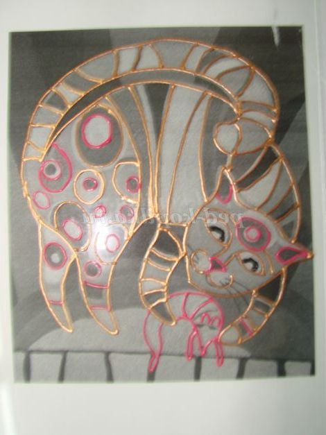 3. Кота я обвела чорним контуром. Малюнок у кота - бронзовим ( але, якщо Ви новачок в роботі з вітражними фарбами - візьміть тільки чорний контур. Якщо випадково зайдете фарбою на контур, це буде не так помітно).