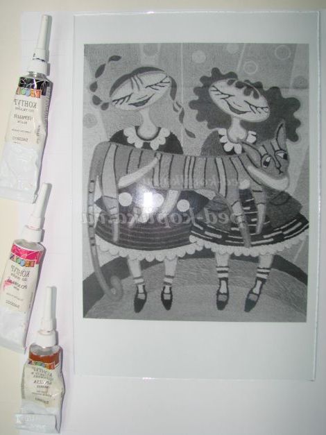 Малюнок перекладається на поверхню контуром (не забудьте знежирити поверхню!), (прослідкуйте, щоб всі лінії контуру були замкнуті, інакше фарба витече за його межі туди, куди зовсім не потрібно, і можна зіпсувати роботу).