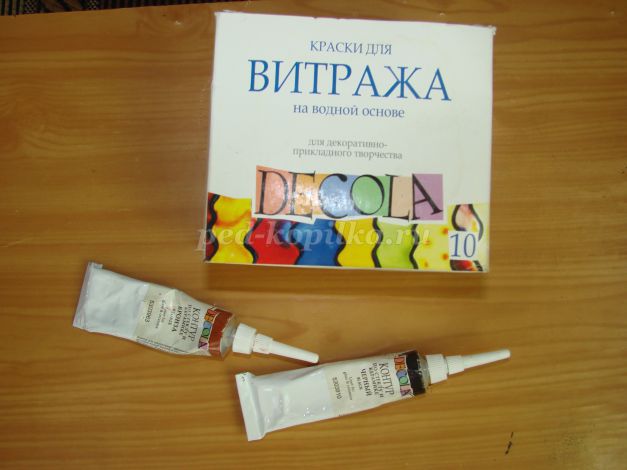 4. Вітражні фарби ( я скористалася Деколой і Гамою. Мені подобаються їх кольору, прозорості, склоподібність при висиханні, і потім вони чудово змішуються) . Найдоступніші з вітражних фарб і аж ніяк не найгірші.