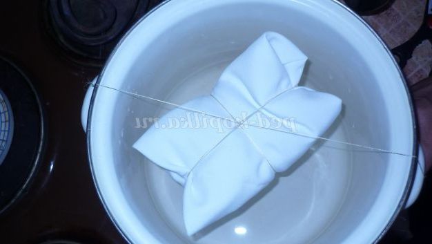 Час запарювання залежить від щільності тканини, мотузкою фіксують згорнуте виріб і прив'язують його до палиці, палиця повинна бути довшою діаметру каструлі для запарювання.