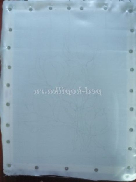 11. Оформлення роботи у рамку. Обрізати краю тканини, щоб розміри тканини відповідали розмірам рамки, накласти тканина на картон, прикріпити дрібними цвяхами. Додатково можна прикрасити квіти краплями сріблястого гелю.