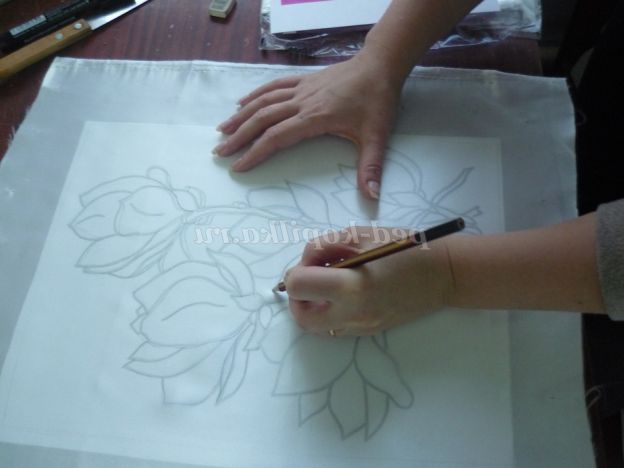 5. Перенести малюнок з паперу на тканину Готовий лінійний малюнок підкласти під тканину і обвести м'яким олівцем.