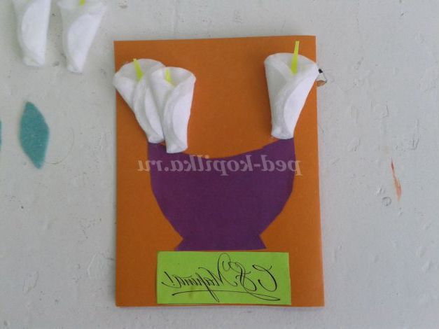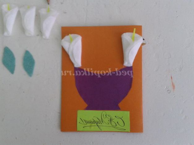 Кольоровий картон, кольоровий папір, ватні диски 5 штук, клей, ножиці, простий олівець, напис «З 8 березня!», шаблон вази, заготівля жовтої серединки квітки Кали 5 штук, заготівля зелених листочків з серветок 3 штук.