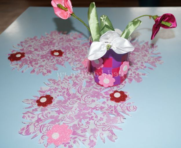 Залишилося нашу вазу прикрасити. Беремо самоклеючі декоративні квіти і приклеюємо до неї. Ось ваза готова!