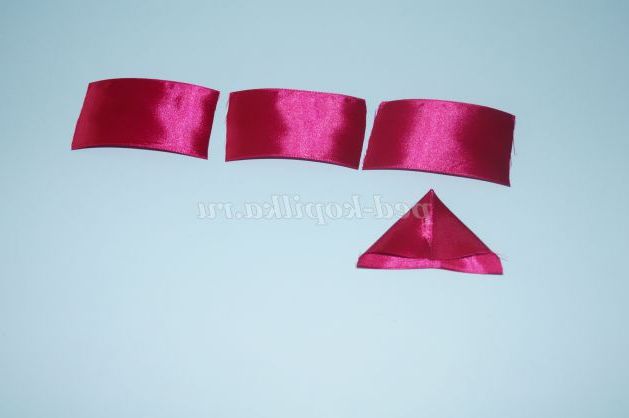 Від атласної стрічки відрізаємо 3 шматочки по 3 см і складаємо ці шматочки кутиками до себе, виходить трикутник.