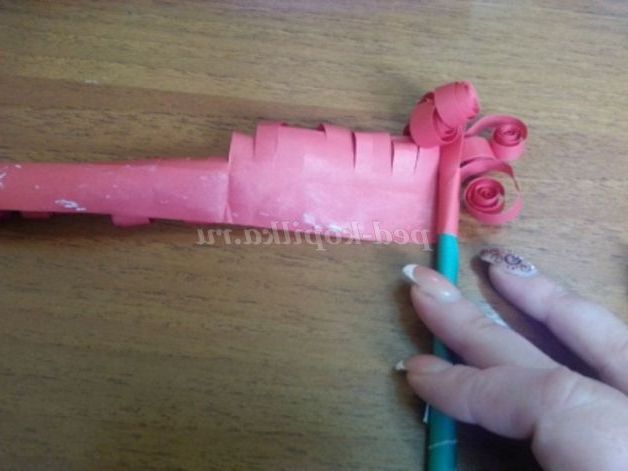 9. Беремо кінчик квітки і приклеюємо його до стеблинки по діагоналі, плавно спускаючись до середини стебла