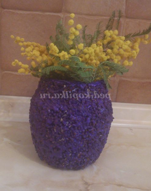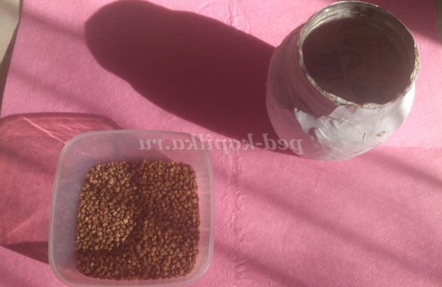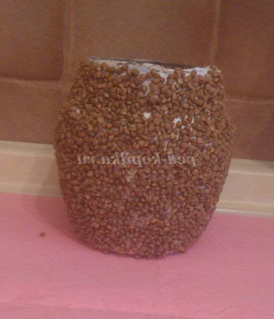 3. Потім необхідно нанести на вазу невеликими ділянками густий клей ПВА і густо посипати гречаною крупою. Гречану крупу необхідно притискати рукою до поверхні . Покрити вазу повністю гречаною крупою і дати їй підсохнути.