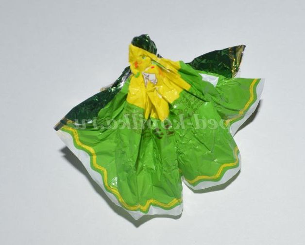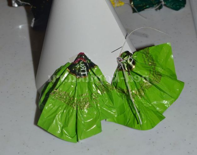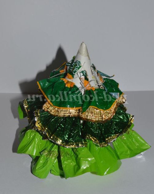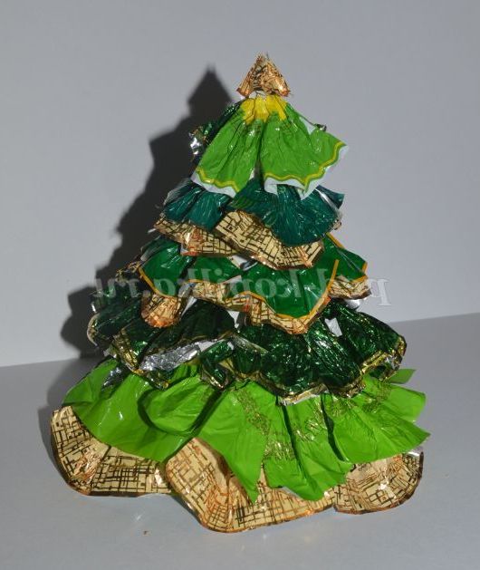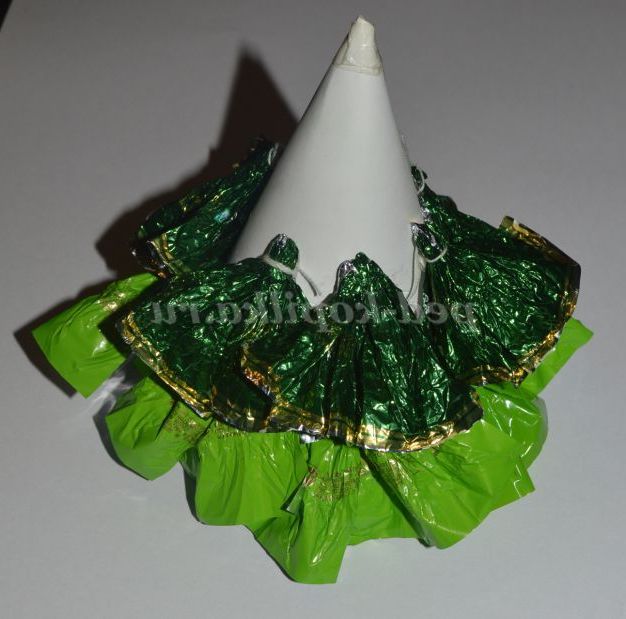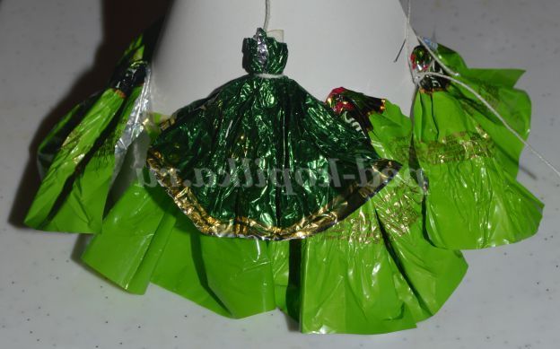 Нижній ярус теж можна прикрасити фантиками іншого кольору. Все робимо, як 3 способом, тільки фантики одного кольору. Прикріплюємо під зелені гілочки на двосторонній скотч.