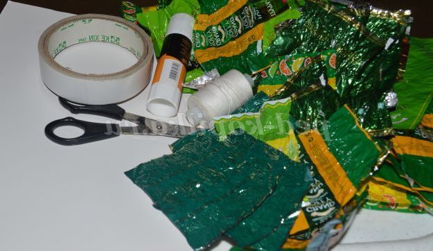 Фантики від цукерок, ножиці, лист щільного паперу, степлер, клей ПВА, скотч тонкий двосторонній.