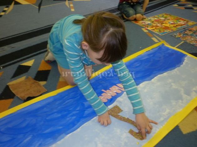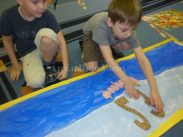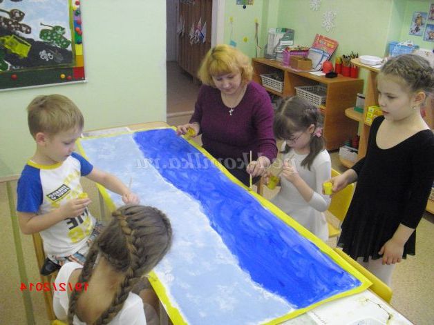 але і сюрприз. Вирішили, що ми будемо робити колаж! Працювали ми з дітьми довго і наполегливо. Вся робота виконувалася у кілька занять. Спочатку ми підготували основу для колажу, для цього ми взяли два ватману, склеїли їх між собою, вийшов великий плакат. Потім намалювали на ньому море, небо, горизонт, рамку.