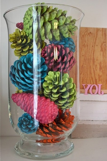 А ще можна покласти такі різнокольорові шишки в скляну вазу і Ви отримайте Новорічну композицію.