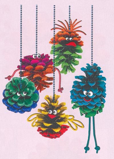 Буде потрібно: соснові шишки, гуаш, кольоровий папір, обрізки різнокольорової пряжі, тонкі ланцюжки, клей, прозорий лак, пензлі, ножиці.