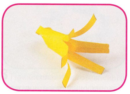 4. З жовтого паперу виріжте прямокутник розміром 3 сантиметри на 4 сантиметри. Скрутіть його трубочкою, заклейте. З одного боку зробіть довгі надрізи, з іншого короткі.
