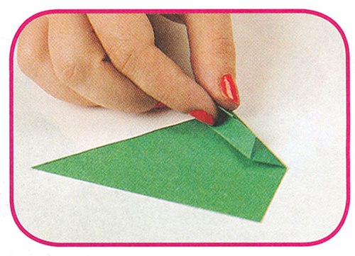 8. Для виготовлення листочків виріжте 2 прямокутних трикутника зі сторонами 9 див. Складіть їх гармошкою починаючи з боку, протилежного прямому куту.