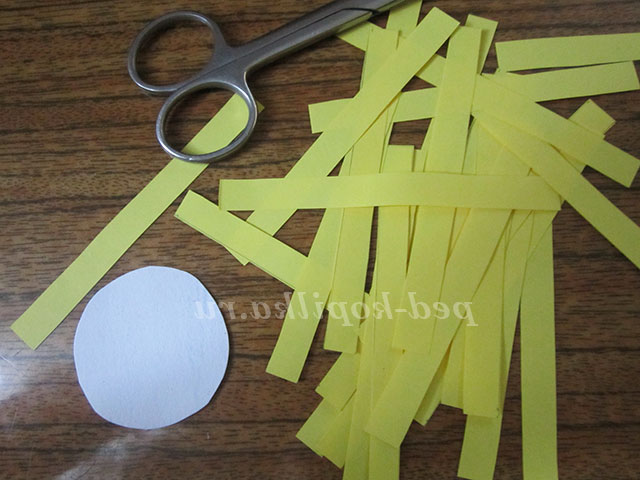 Коли всі петлі готові, вирізаємо з картону круг і починаємо від краю до середини приклеювати петельки по колу. Спочатку один ряд, потім другий і так стільки, скільки необхідно.