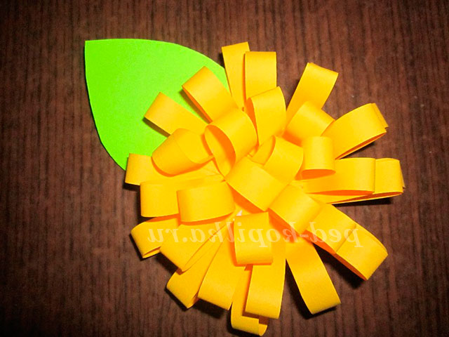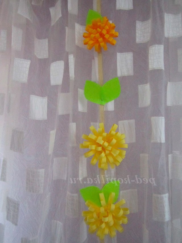 Таких квітів може бути кілька. Різного кольору, розміру. Можна використовувати їх для оформлення листівок, ваз і т.д. А можна прикріпити їх на тасьму і зробити каскад з таких стрічок для оформлення стіни, вікна.