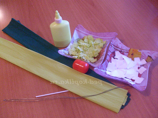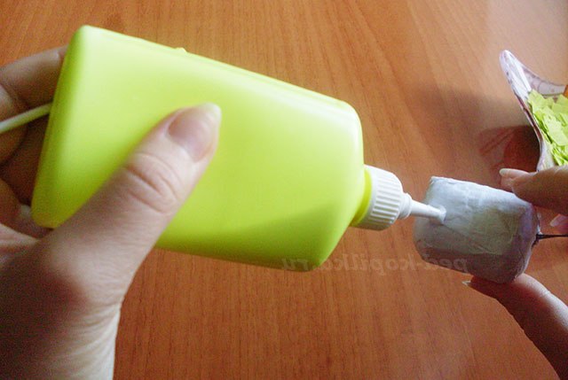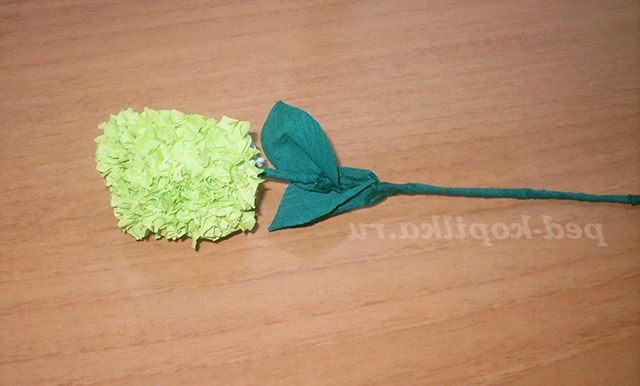Тепер приступаємо до виконання стебла. А для цього відріжемо невелику смужку гофрованого паперу зеленого кольору, нанесемо на неї тонким шаром клей і накручуємо на стебло-дріт.