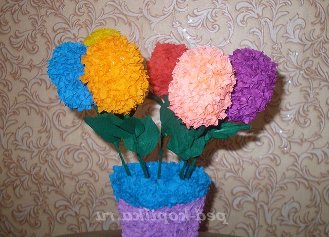 Отриманий букет можна поставити в будь-яку вазу, але я виконала її в тій самій техніці, що й квіти. В основу вази я взяла невеликий горщик, обклеїла папером і проторцевала.