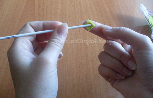 Тепер робимо торцовочки. А для цього візьмемо раніше підготовлений квадратик гофрованого паперу і накручуємо його на тупий кінець стрижня.