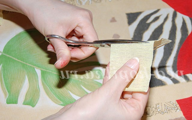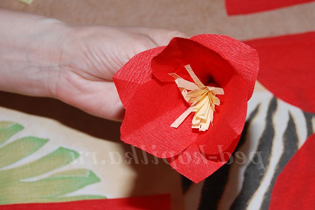 1. Надріжте жовтий прямокутник, потім скрутіть його в трубочку і акуратно вклейте в квітку.