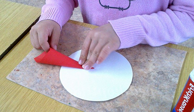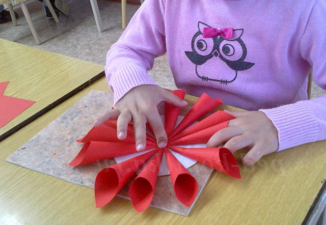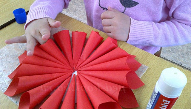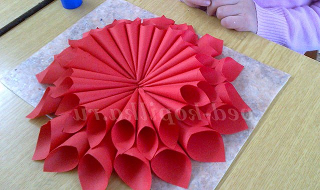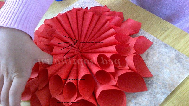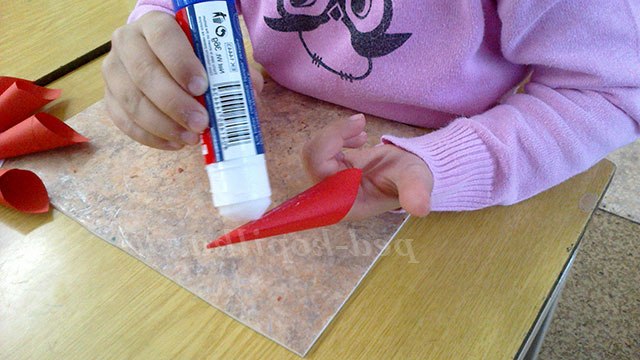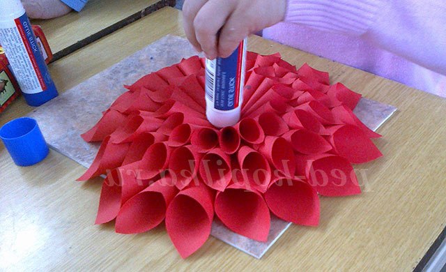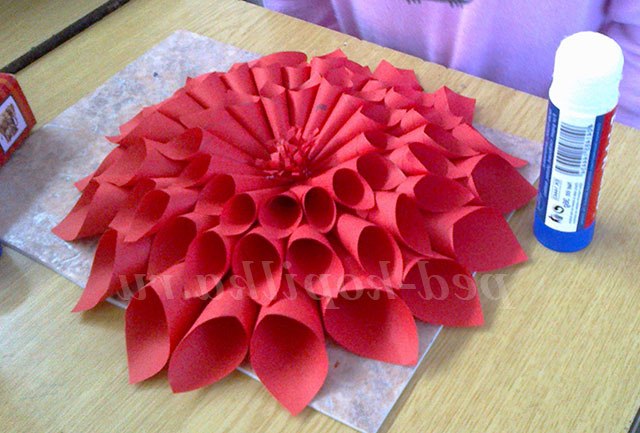 4. Коли «кульочки» - пелюстки підсохнуть, приклеюємо їх тильною стороною на основу, по колу, залишаючи в центрі трохи місця для другого і третього рядів.