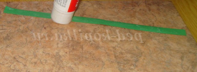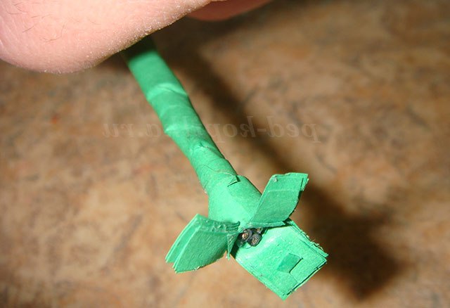 На край стеблинки, де повинна бути головка квітки, наносимо клей. І накручуємо на цей край смужку зеленого паперу, так, щоб її край виходив за межі стебла.