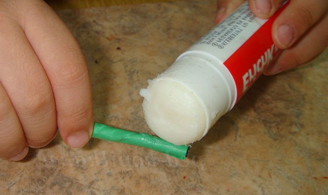 На смужки зеленого паперу наносимо клей і обмотуємо ними дріт - виходить стеблинка.