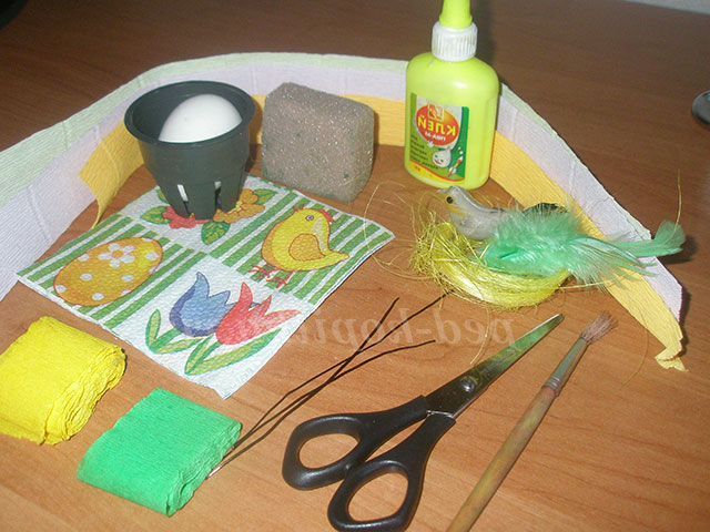 Матеріали: пластиковий стаканчик, гофрований папір, клей ПВА, ножиці, яєчна шкаралупа, серветки, оазис або пінопласт, різний матеріал для декорування - сизаль, пір'я.