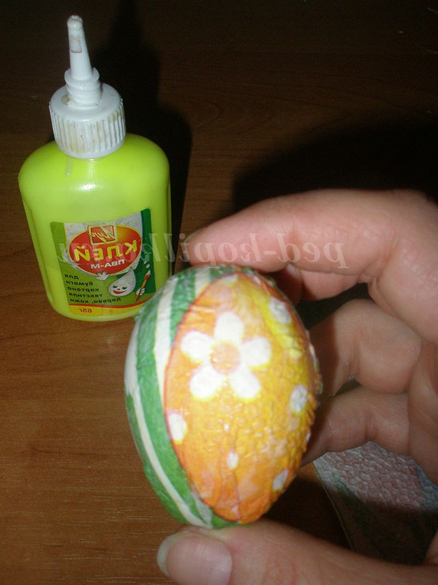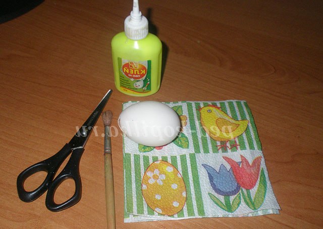 Для декупажу яйця нам знадобиться - барвиста серветка, клей ПВА, ножиці і, звичайно, саме яйце (порожнє).