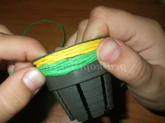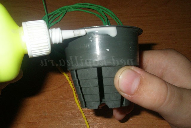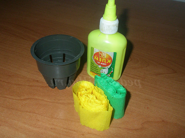 Для виготовлення кошики нам знадобиться пластиковий стаканчик, гофрований папір шириною 2-3 см і клей ПВА.