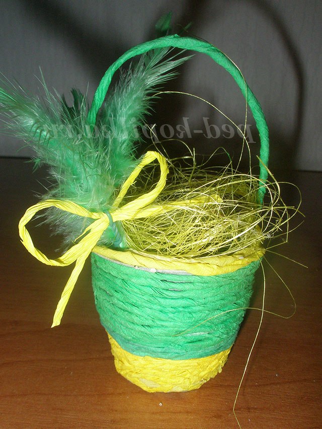 Декоруємо сизалем, пір'ям, бантиком з паперу. Корзиночка готова!