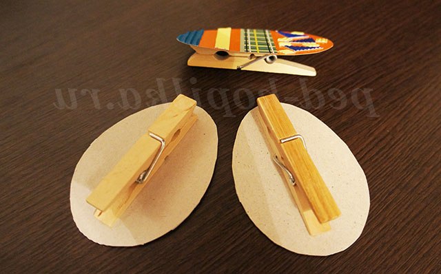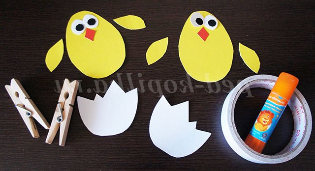 6. Готові прикрашені шаблони великодніх яєць і курчат перевертаємо і кріпимо на них смужки двостороннього скотчу, на смужки скотчу закріплюємо дерев'яні прищіпки.