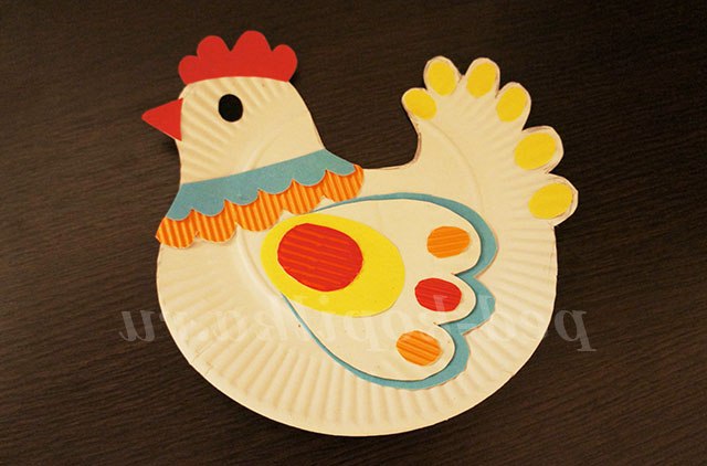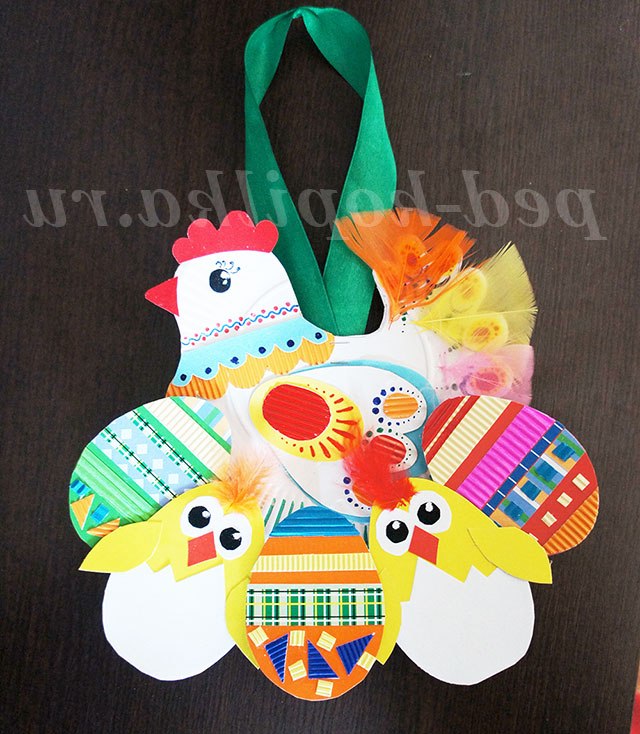 Робота виходить яскрава, до того ж універсальна, завдяки прищепкам, які прикріплені до курчатам і великодніх яйцях, тому композицію можна завжди міняти. Основа - курочка, вирізана з паперової тарілки.