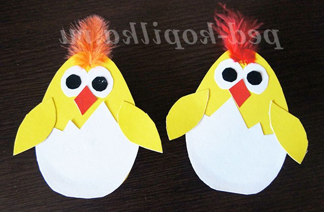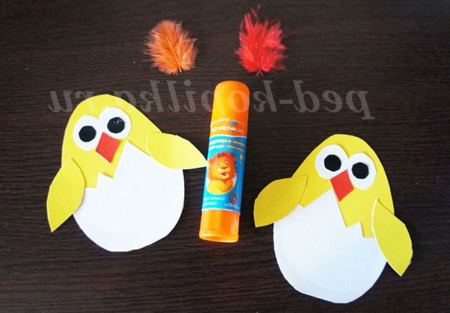4. Вирізаємо тулуб курчат і крильця з жовтого картону, з оксамитовою білого паперу - шкарлупки . Очі курчатам вирізаємо кружечки з білої і чорної оксамитової папери , наклеюємо на білі кружечки чорні очі готові. Дзьоб для курчат вирізаємо з червоного картону у вигляді ромба і приклеюємо. Приклеюємо шкарлупки і вирізані крильця.