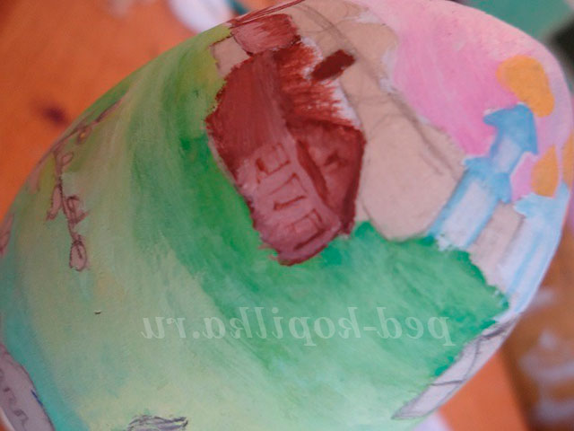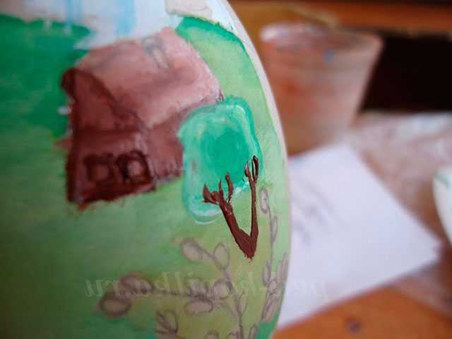 5. Розфарбовую церкви, хати, наношу відтінки.