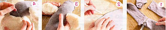 8. Присборите одну з відкритих сторін тулуба, ушийте голову (фото 4). Набийте синтепоном, зашейте відкритий край і пришийте ноги (основне фото).