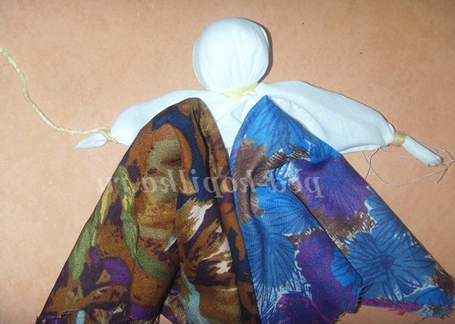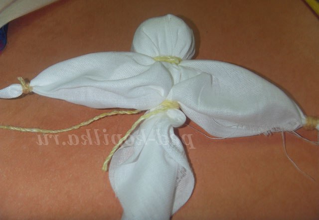 Тепер робимо руки: протилежні кінці білого клаптя вирівнюємо і фіксуємо нитками кінці рук,