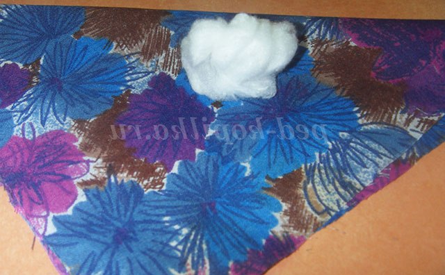 Квадратні шматки спідниці складаємо трикутником,моместив в середину по шматочку вати.