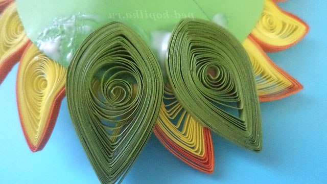 Розміщуємо на звороті квітколожа листочки через 1 проміжок (всі етапи роботи, як для 1 соняшника).
