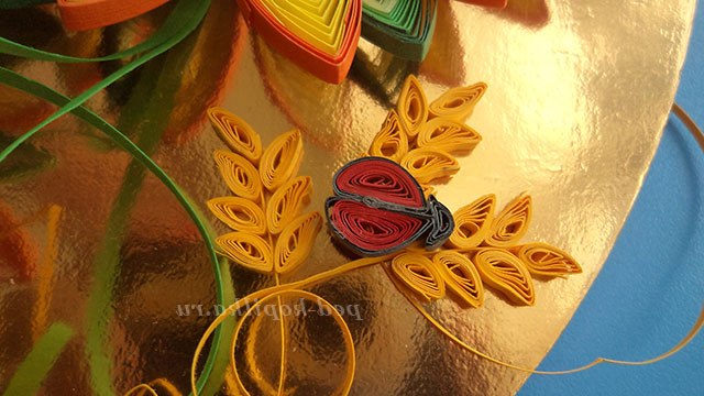 Ну і звичайно не обійшлося без маленької комашки-сонечка. Я склеїла червону і чорну смужки, накрутила починаючи з червоного кінця, надала їм форму, аналогічну зернышкам колосочків, і склеїла їх разом поруч. Зверху з чорної смужки, форма та ж, зробила і приклеїла голівку. Вийшла така корівка.