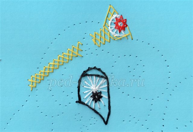 10. Зіниця ока вишиваємо як коло (4 кроки по лицьовій стороні і 1 крок по виворітній стороні) - чорним кольором. Так само камінь в короні - червоним кольором