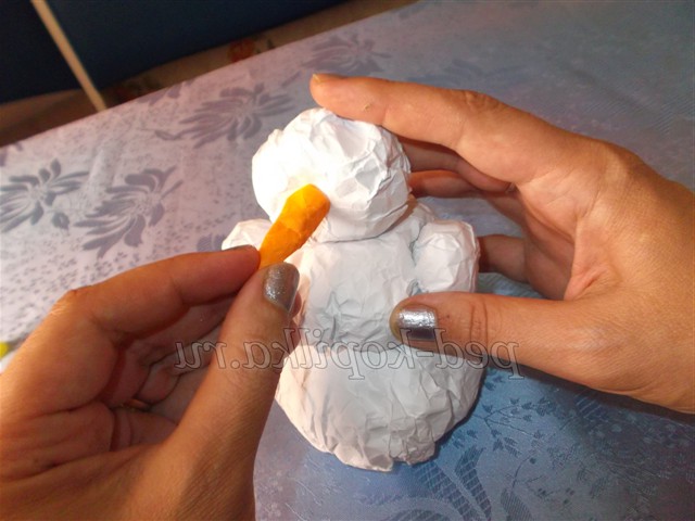 Чудовий ніс - морквину приклеюємо на голову сніговика, в області обличчя.