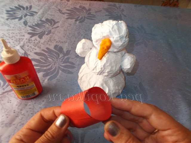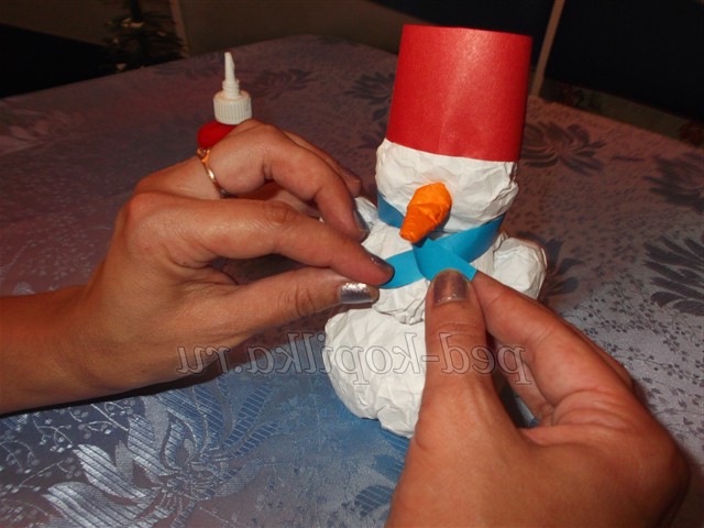 Приклеюємо смужку (синій) паперу навколо шиї сніговика - робимо своєрідний шарфик.