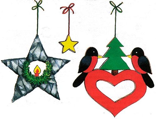 Так само можна зробити підвіску-зірку з щільного картону, акуратно обернути її фольгою і прикрасити аплікацією зі свічкою і ялиновими гілками.