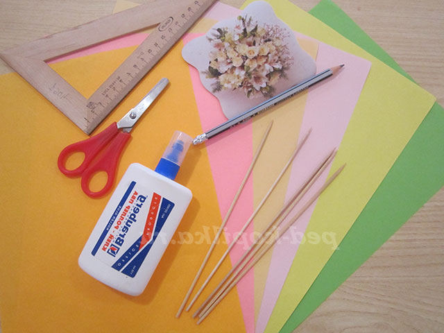 Для виготовлення одного такого квітки потрібно: 2 аркуша кольоровий двосторонній паперу формату А4, ножиці, клей ПВА, лінійка, шпажка для шашлику, і папір зеленого кольору для стебла і листків.