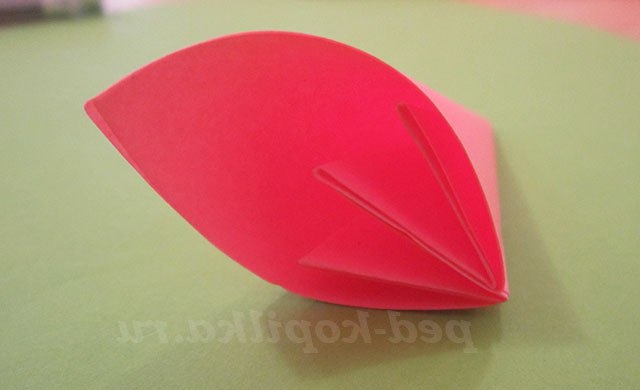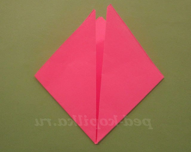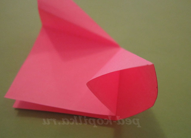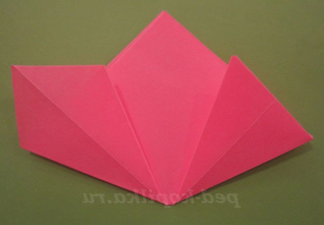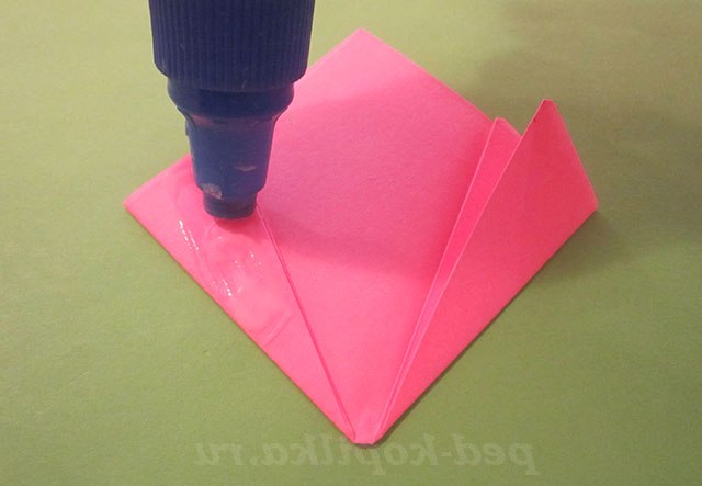 Розрізаємо аркуш паперу на квадрати зі стороною 9 - 10 див., таких квадратів для однієї квітки потрібно 8 шт. Кожен квадрат складаємо по діагоналі, поєднуючи протилежні кути, щоб вийшов трикутник.