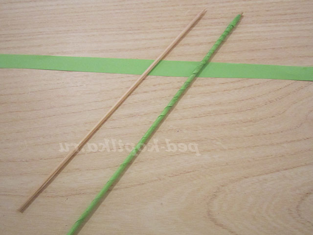 Приступаємо до виготовлення ніжки. Взяти шпажку обклеїти її вузькою смужкою зеленого паперу.